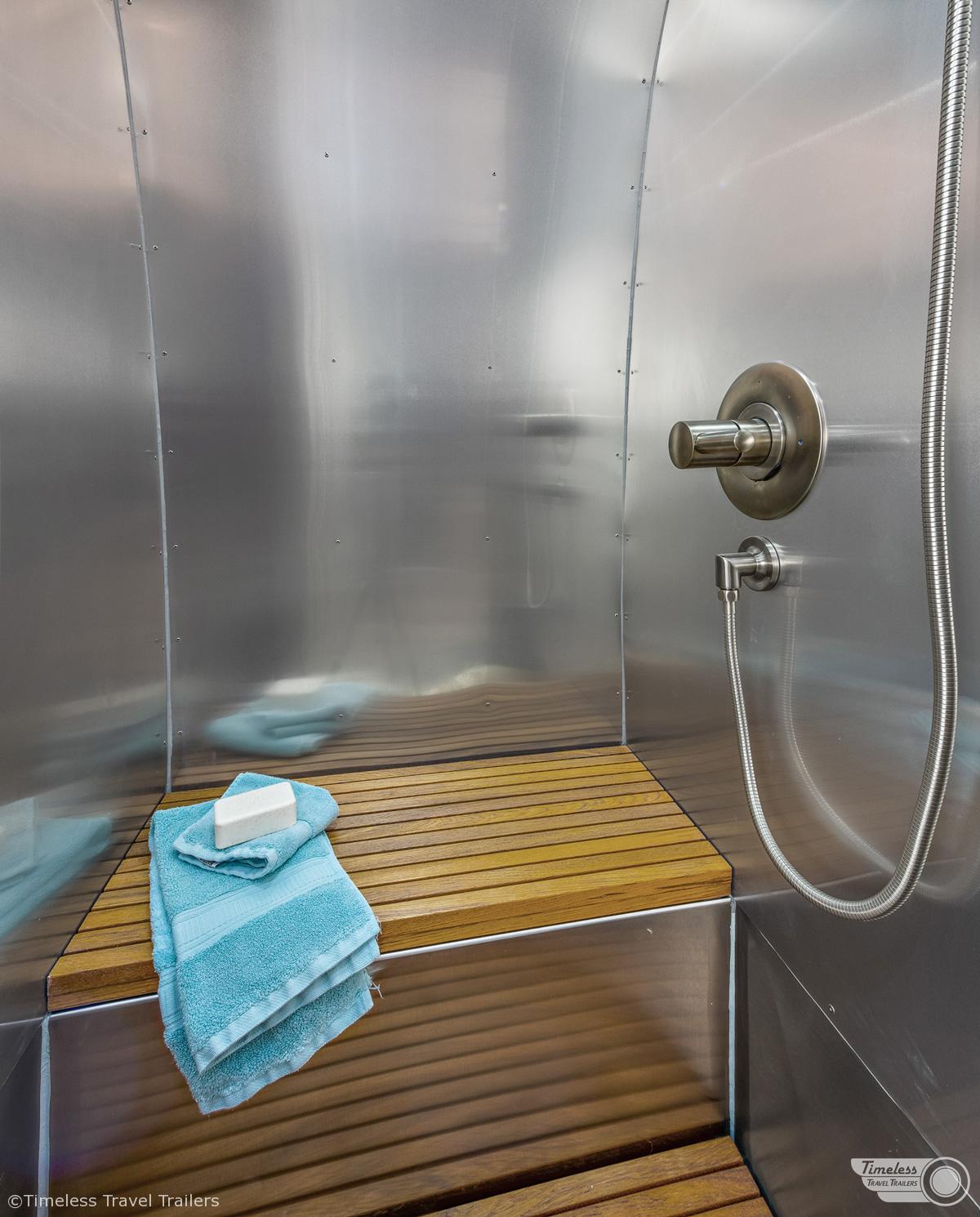 custom stainless shower with teak duckboard